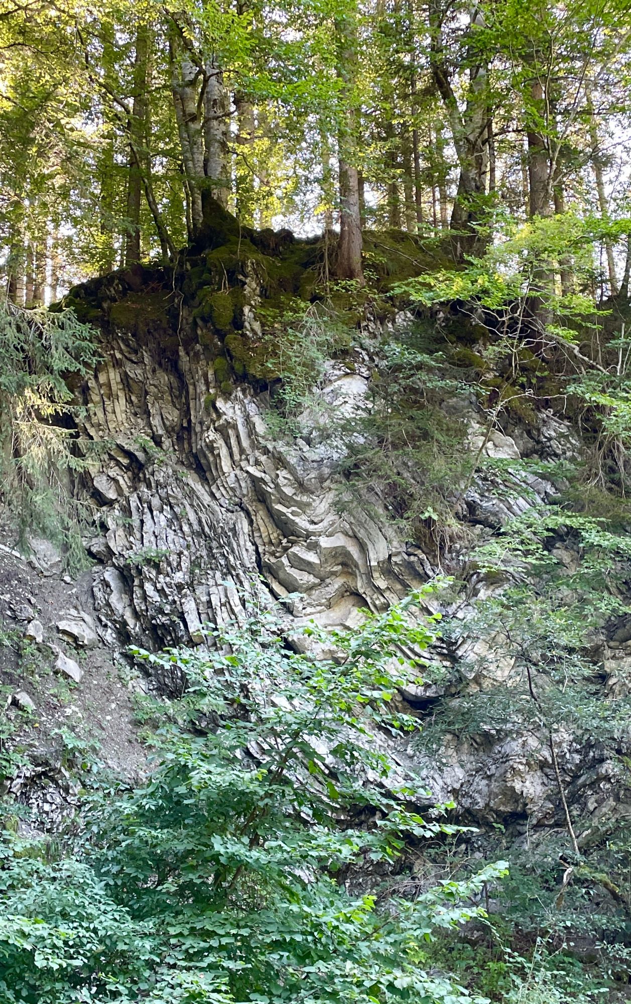 Der heutige Tag war eine echte Herausforderung für uns. Um 8.30 Uhr fuhren wir mit dem Bus nach Wildbad Kreuth und starteten hinter dem Ort in kühler Morgenfrische in Richtung Blauberg (1.525 m). Schnell fanden wir zu einem gleichmäßigen Tempo bei andauernder Steigung, teils über felsigen Untergrund, echt alpin! Im oberen Bereich kamen wir mächtig ins Schwitzen, weil wir der Sonne entgegen wanderten, die mittlerweile recht hoch über uns stand. Unterwegs gab es einiges zu entdecken: Originell verzierte Kuhfladen, wunderschöne Herbstpflanzenwelt, von der Natur hervorgebrachte Kunst, beeindruckende Gesteinsformationen ...