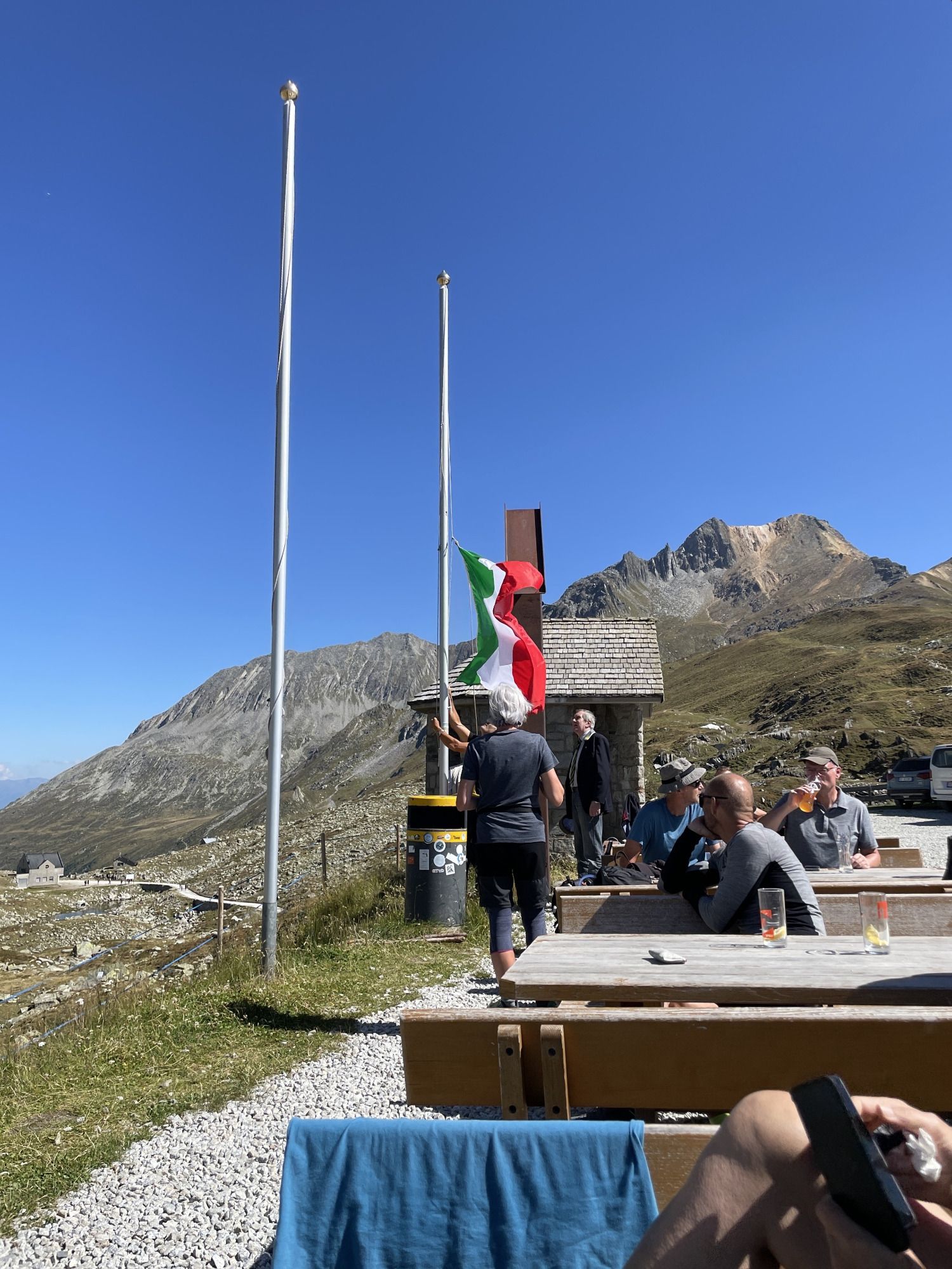 Im stetigen Wechsel von Steig und (ganz wenig) Fahrstraße, Steinplatten und Stufen erreichten wir schließlich den Alpenkamm, für uns der Übergang von Österreich nach Italien (Südtirol). Ein glücklicher, auch ein wenig stolzer Moment mit grandioser Rundumsicht, nun auch zu den Sarntaler Alpen.